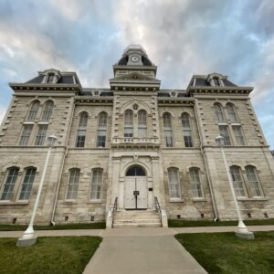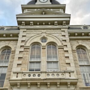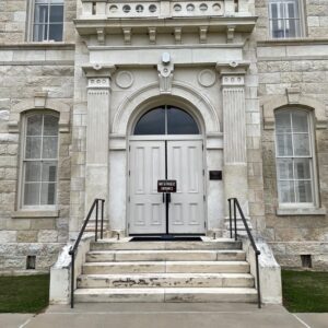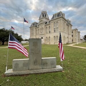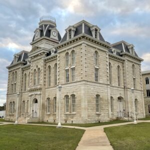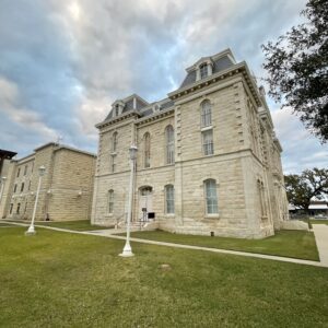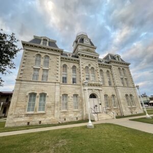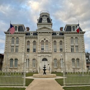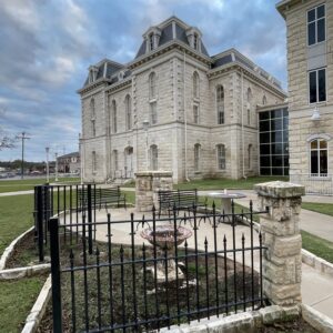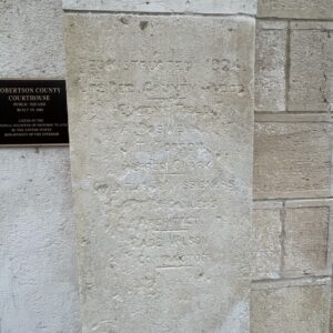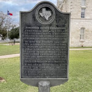 Erected in 1882 at a cost of $30,000, this white limestone building is the fourth to serve as Robertson County Courthouse. In 1879 the county seat had been moved for the fifth time, to Morgan, on the International & Great Northern Railroad. But because Texas already had a post office named Morgan, the town was renamed Franklin for the first county seat, which was named for pioneer Will Franklin. Plans for a courthouse were begun that year; and in 1881 the construction was started, under F. E. Ruffini, architect. Since then the building has been remodeled.
