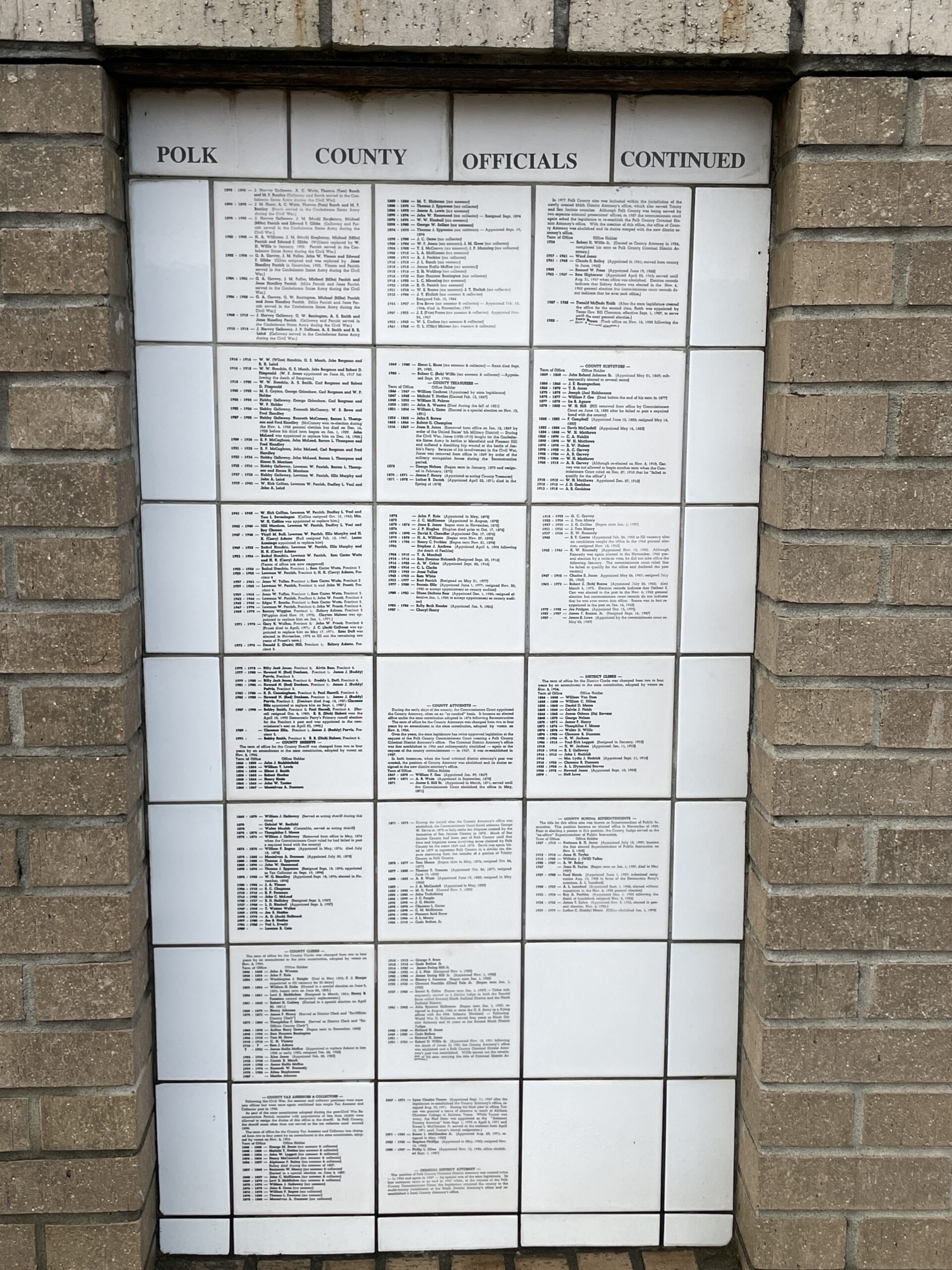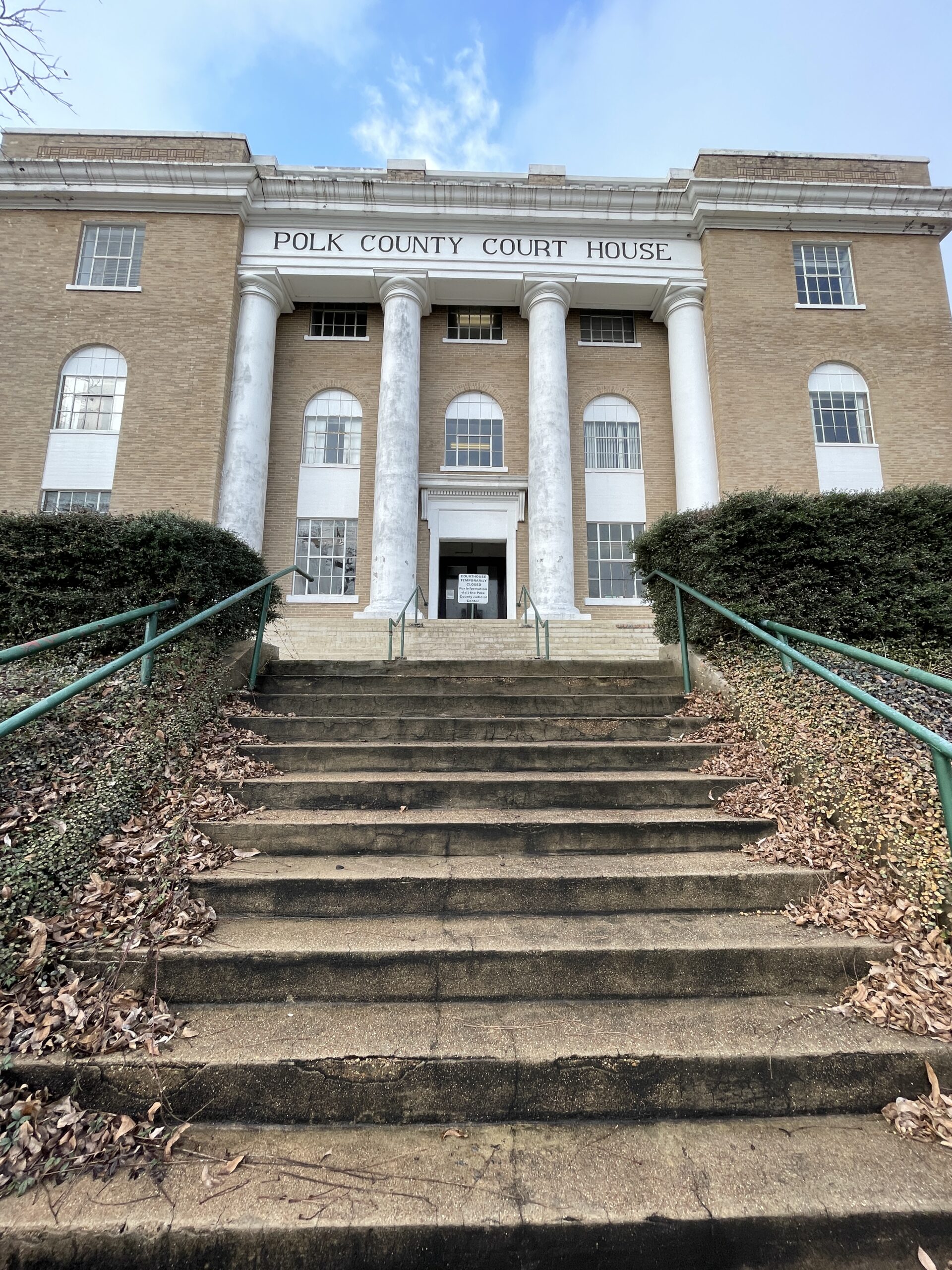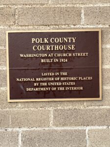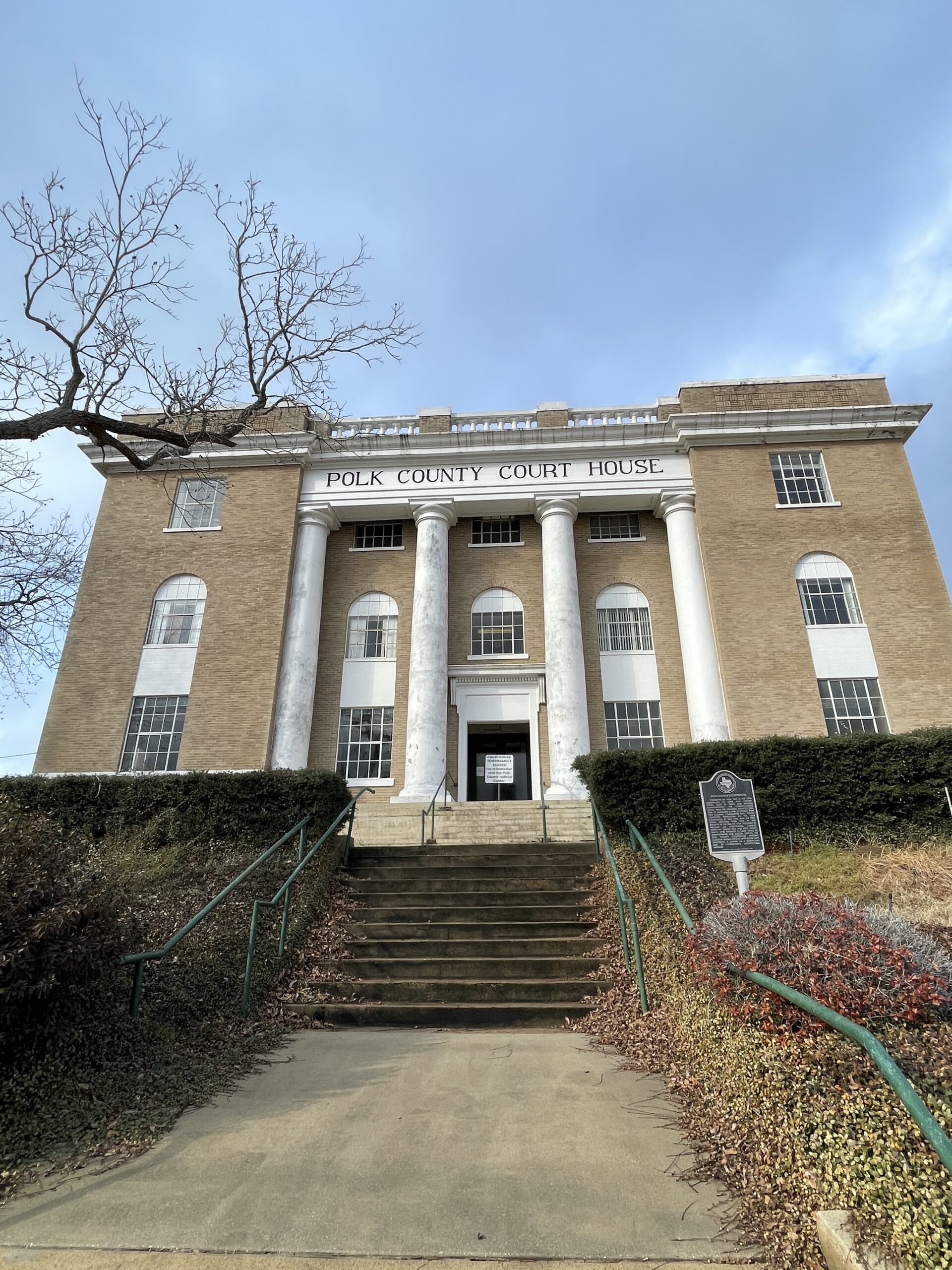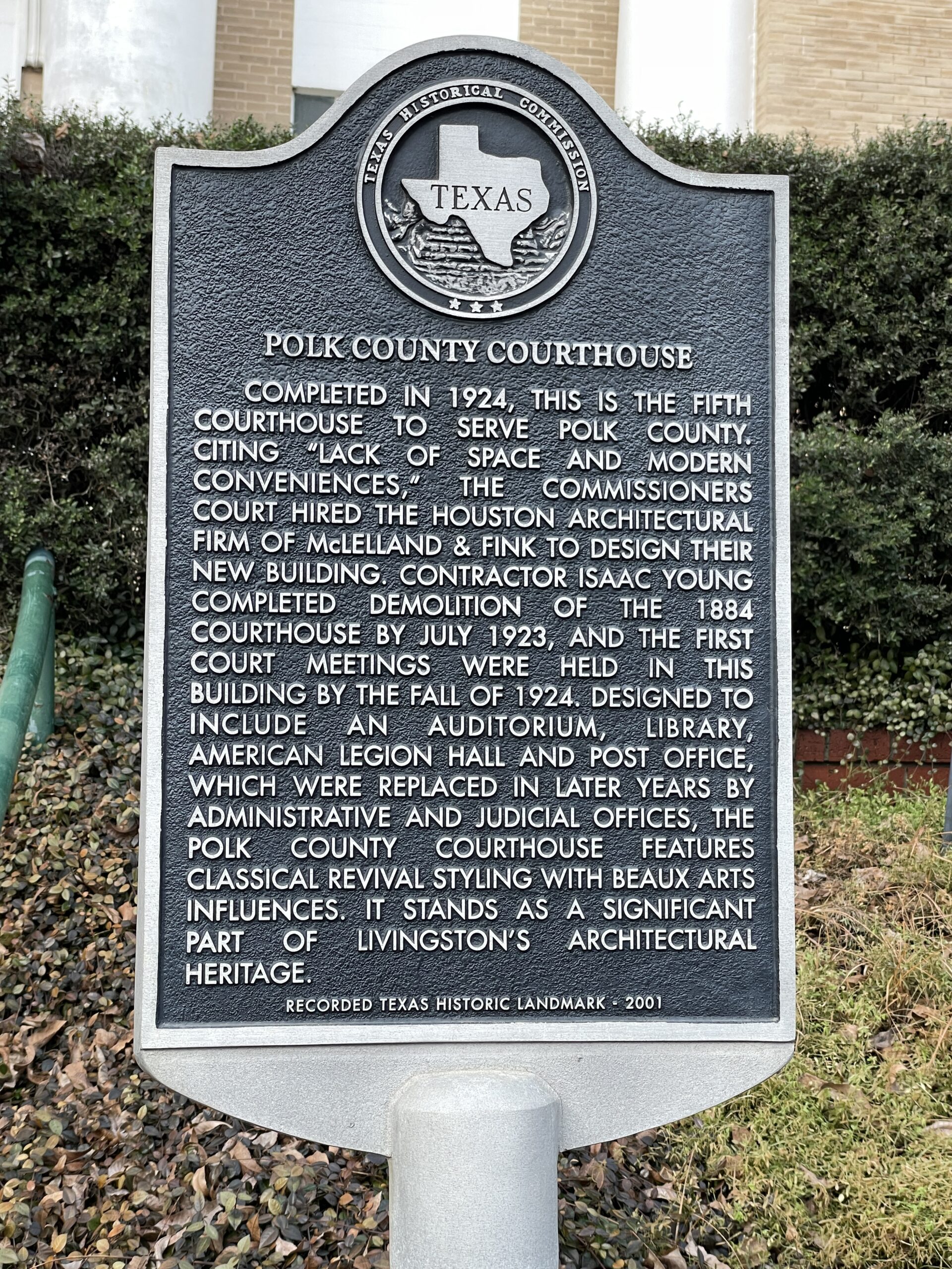 “The Polk County Courthouse, designed by the Houston architectural firm of McLelland & Fink, was built in 1923-24 to answer the needs of a growing and prosperous county. Each elevation of the courthouse is similarly detailed and arranged, the major difference being that the wider north and south elevations of the building have seven bays while the narrower south and north elevations are five bays wide.