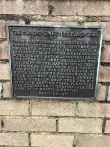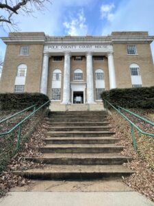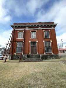 “1854, plans were underway for a two-story brick courthouse. It was 40 feet square with a wide hallway and four offices on the ground floor and one large open courtroom upstairs. The ground floor walls were 18 inches thick. The cost of this building was just under $6,000. The courtroom continued to be the meeting place for local Churches and social functions until 1858. In 1884, the court authorized the enlargement and renovation of the brick building and added a new stone facade at a cost of $17,500. The architect for this project was Eugene T. Heiner and the builder was W.C. Wells.