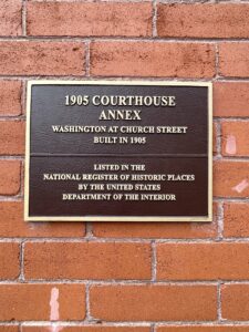 “The 3-story tan brick Classical Revival courthouse features a raised basement, a rectangular plan and a flat roof. The building reflects a simplified Beaux Arts classicism evident in the massive columns dominating the symmetrical facades, strong cornice-line balustrade, arched windows, rectangular plan, flat roof, lack of pediments, and a cross-axial plan.”